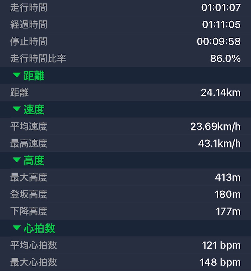 今回のライドでは、平均心拍数が121(bpm)。平均速度は、およそ24km/hという結果に。